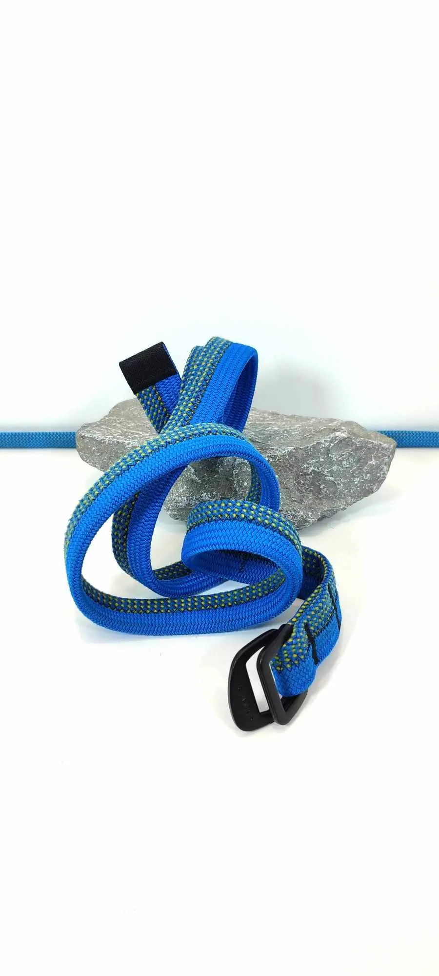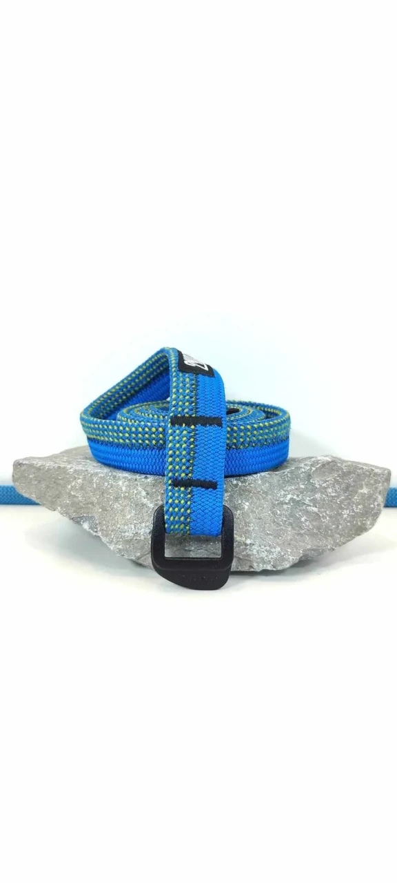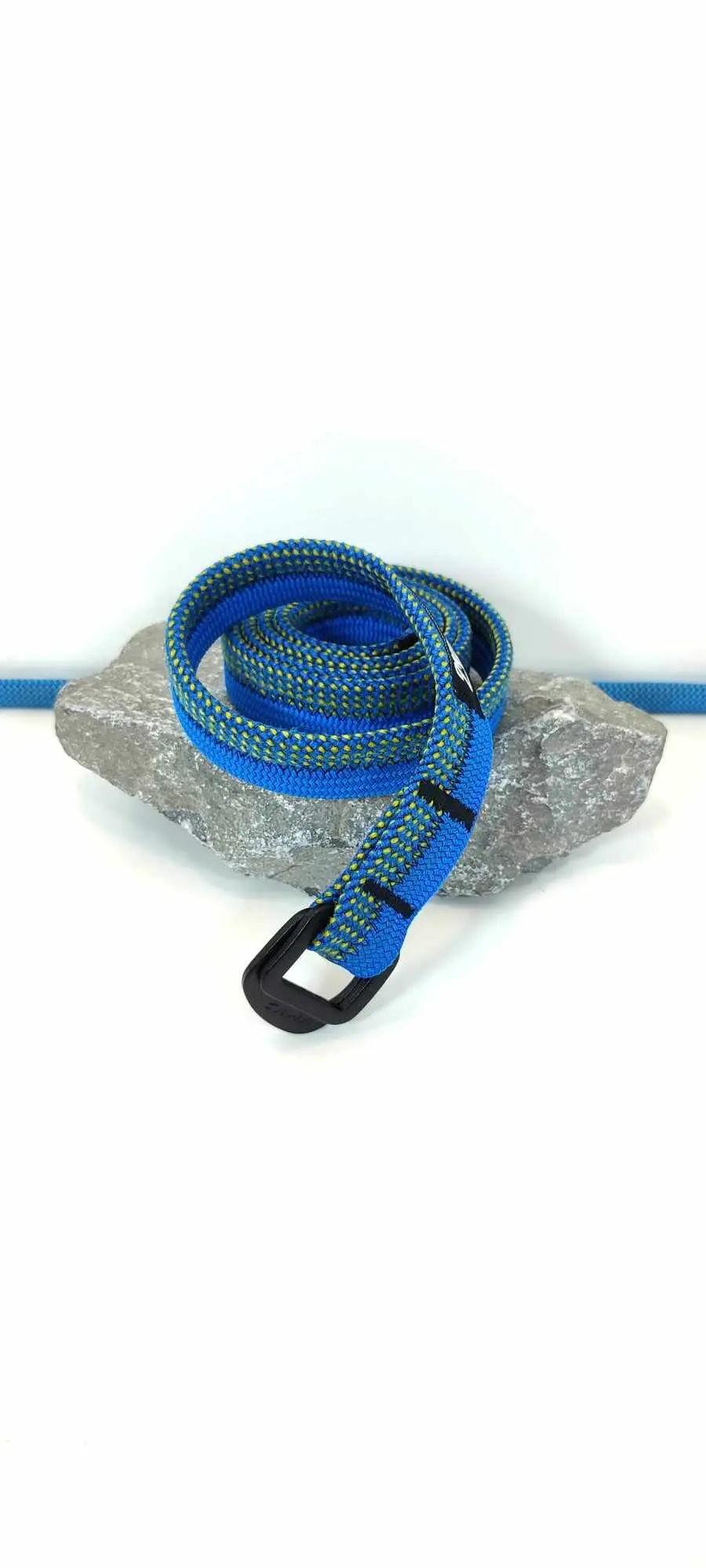Réalisée à partir de cordes d'escalade et d'anneaux de baudrier réformés, cette ceinture s'adapte à la plupart des pantalons et se porte en toute occasion.