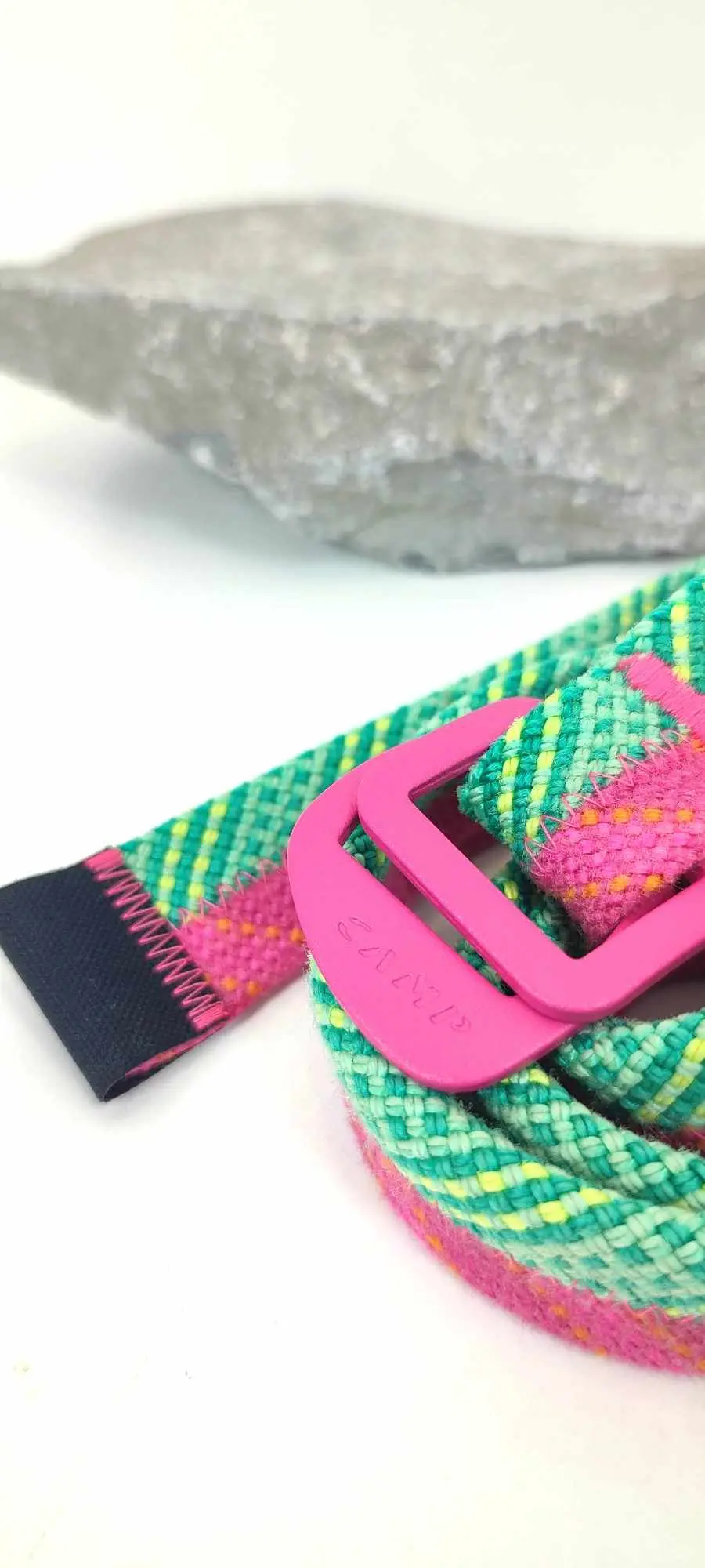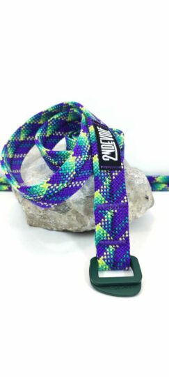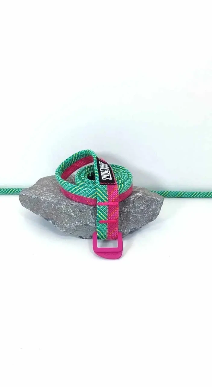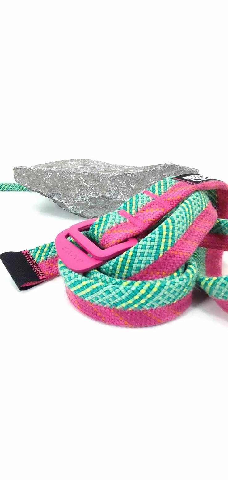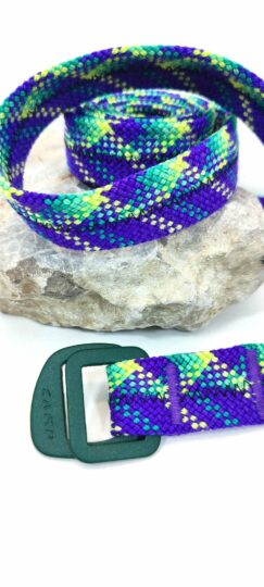 Réalisée à partir de cordes d'escalade et d'anneaux de baudrier réformés, cette ceinture s'adapte à la plupart des pantalons et se porte en toute occasion.