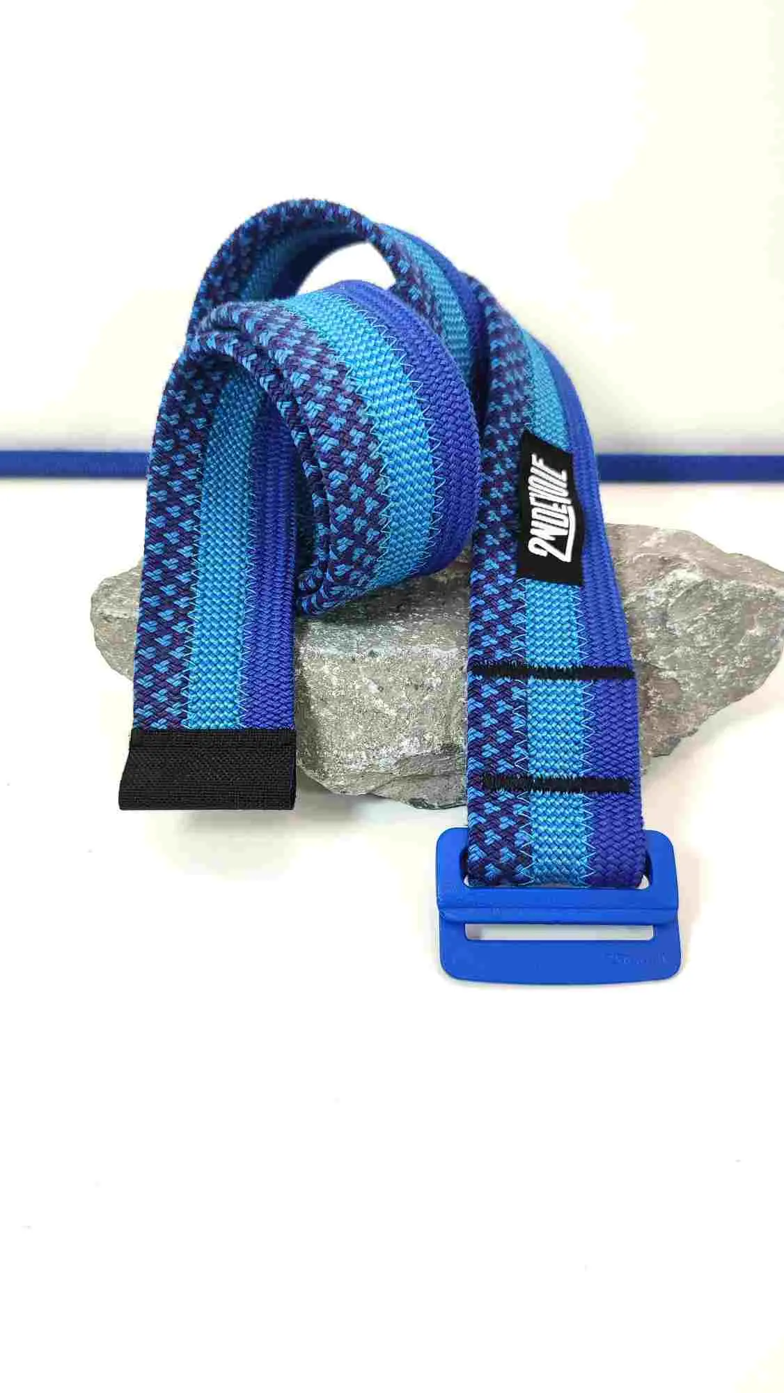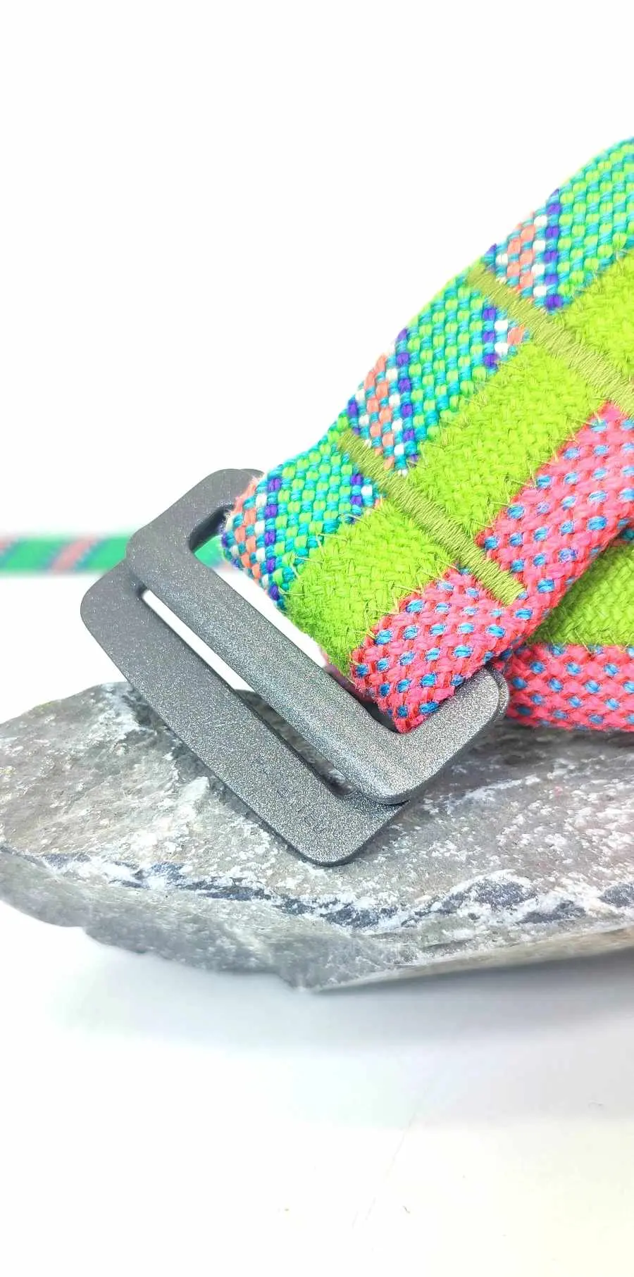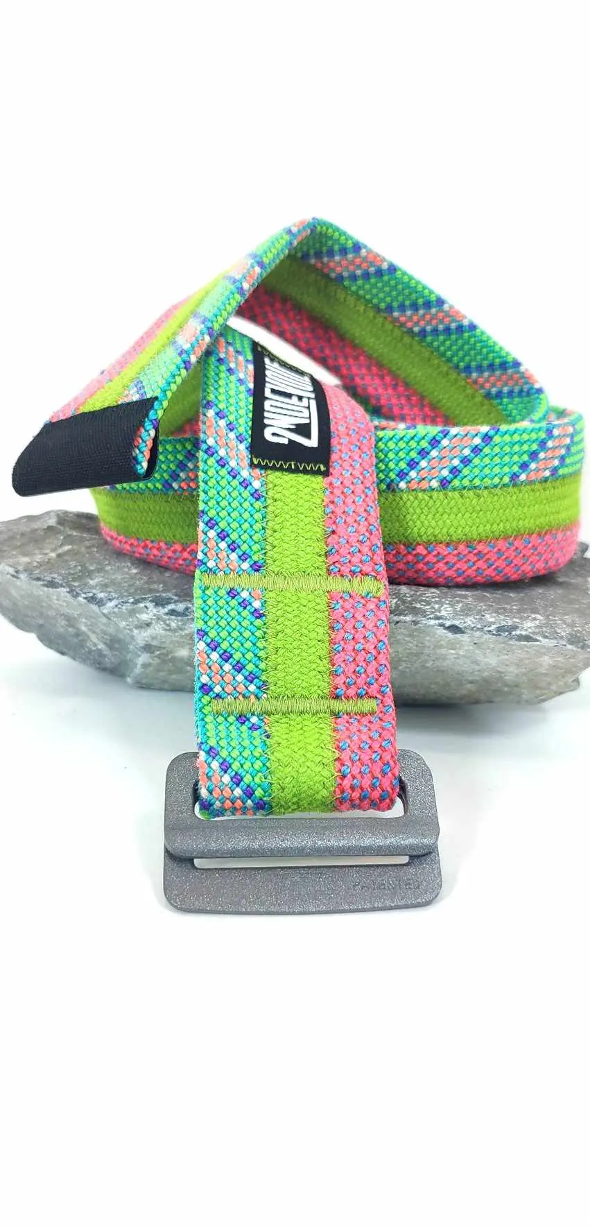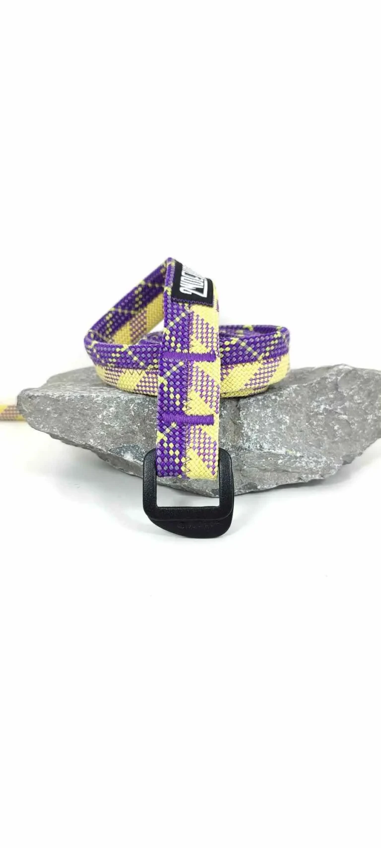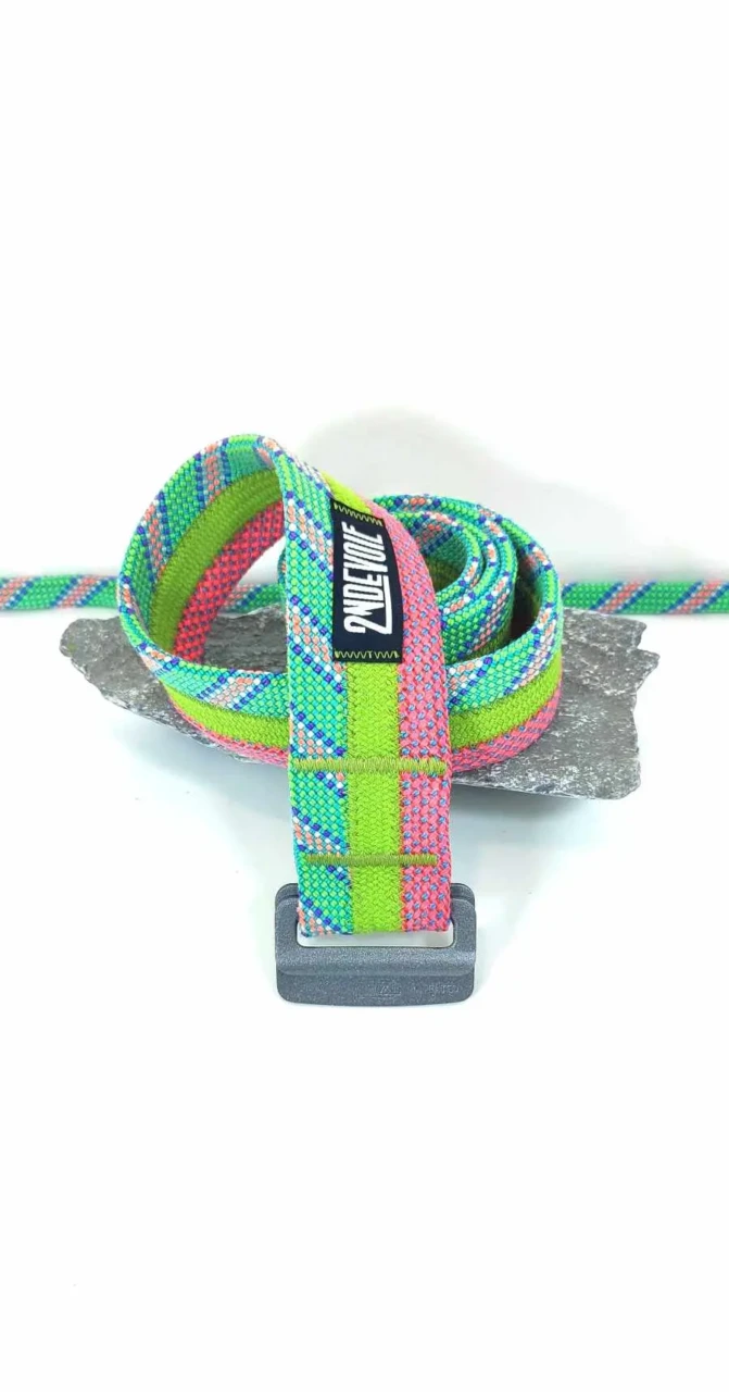 Réalisée à partir de cordes et d'anneaux de baudrier d'escalade réformés, cette ceinture s'adapte à la plupart des pantalons et se porte en toute occasion.