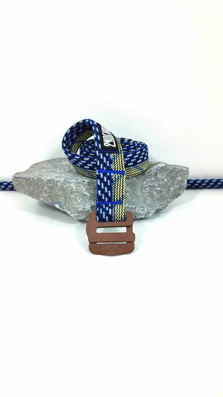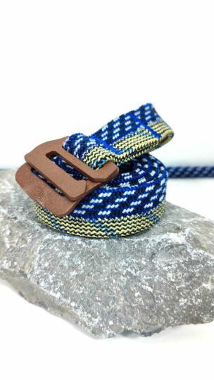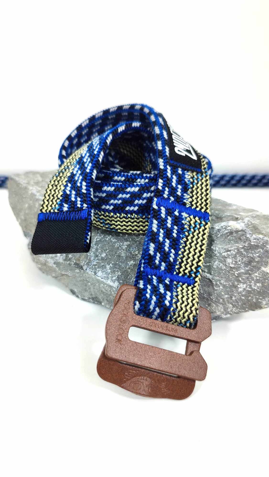 Réalisée à partir d'une corde d'escalade et d'anneaux de baudrier réformés. Cette ceinture s'adapte à la plupart des pantalons et se porte en toute occasion.