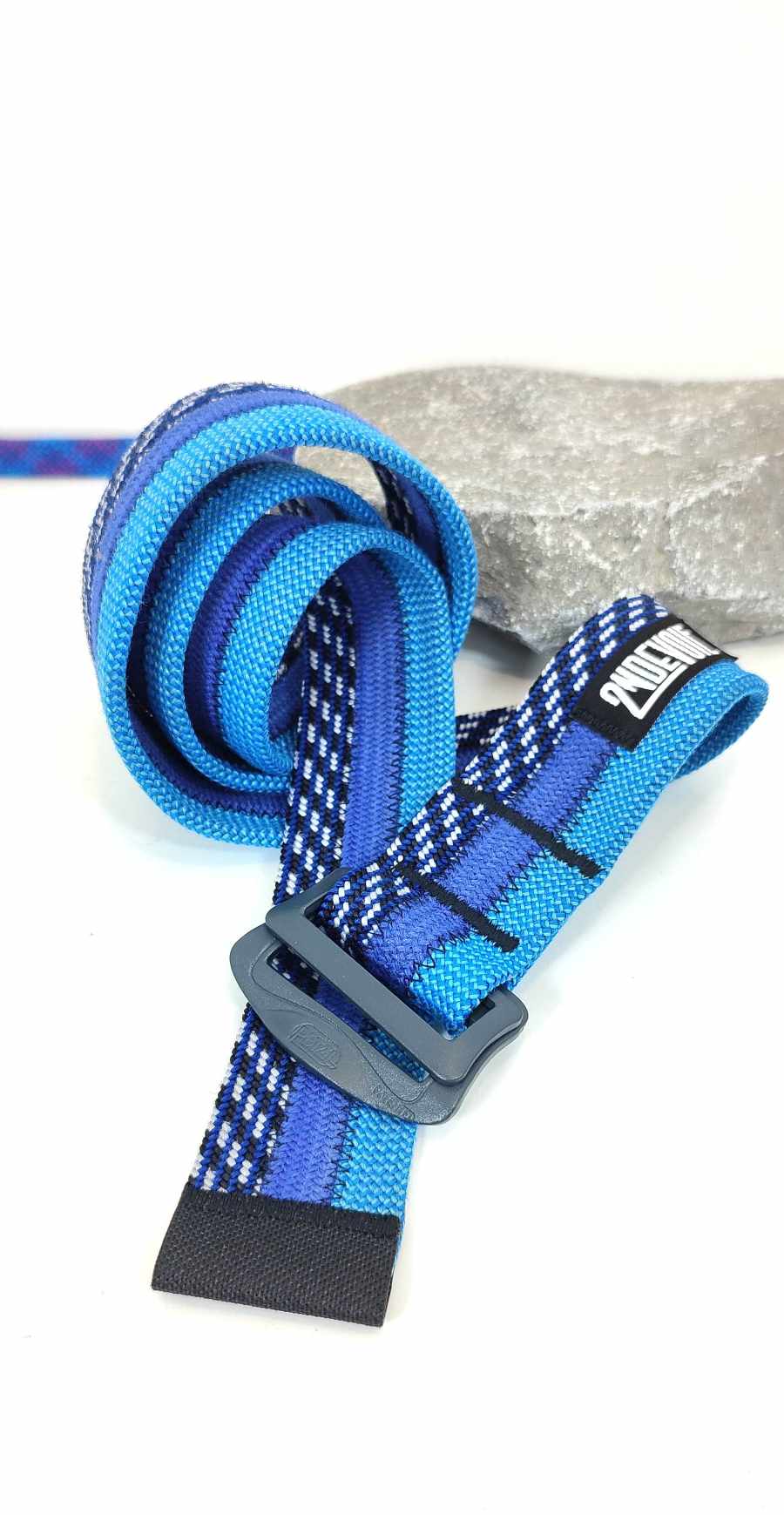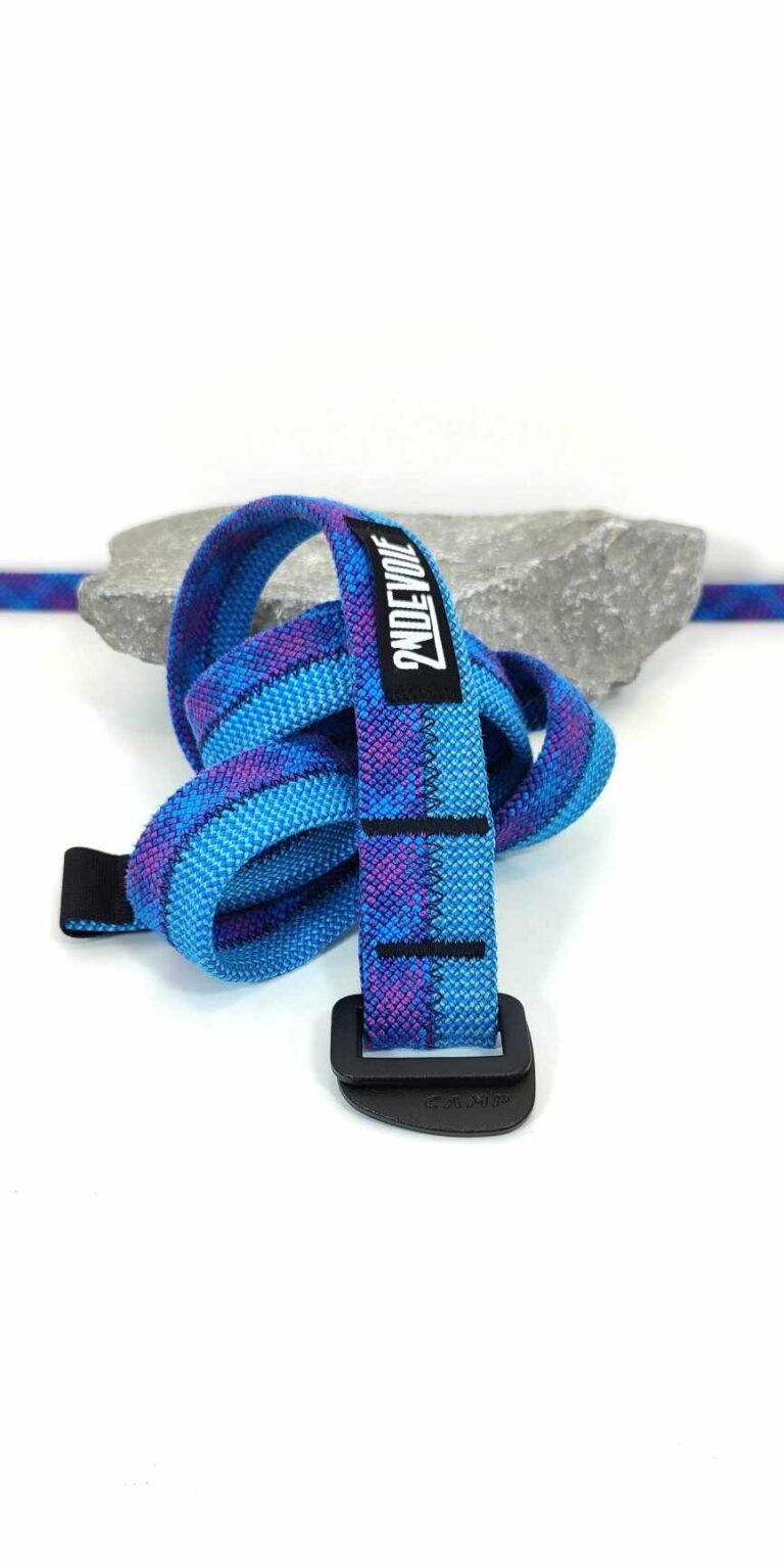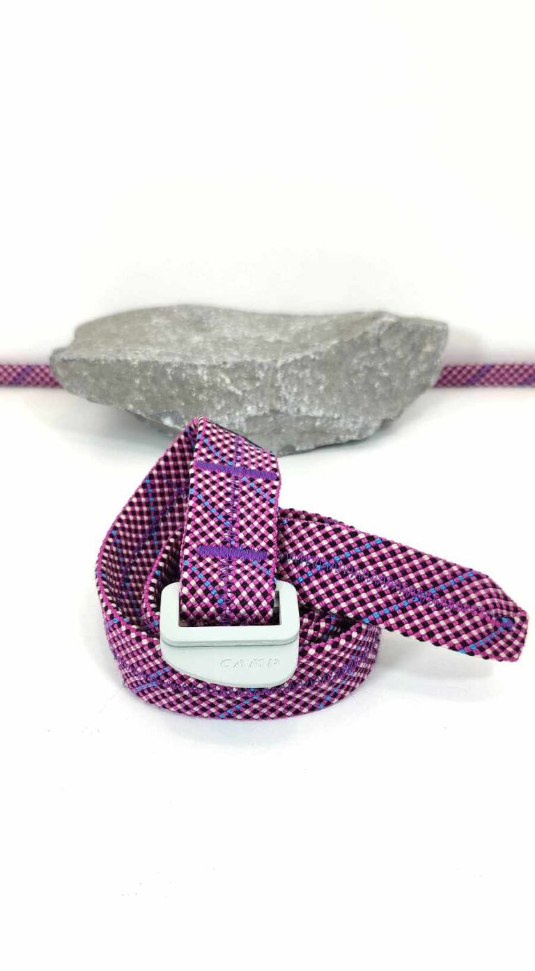 Réalisée à partir d'une corde d'escalade et d'anneaux de baudrier réformés, cette ceinture s'adapte à la plupart des pantalons et se porte en toute occasion.