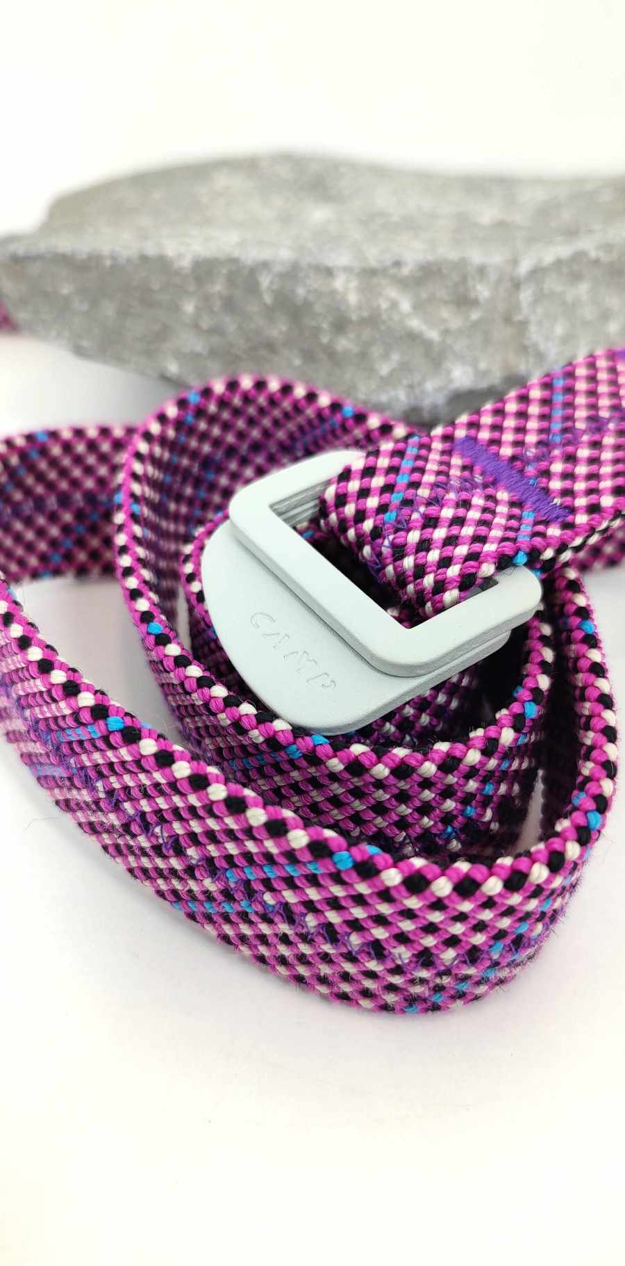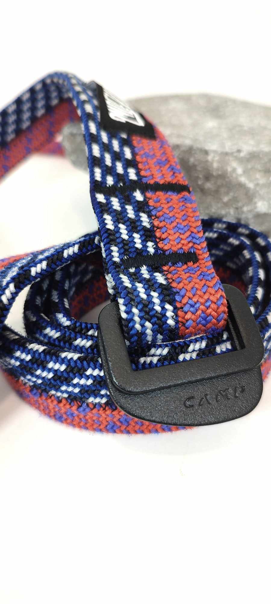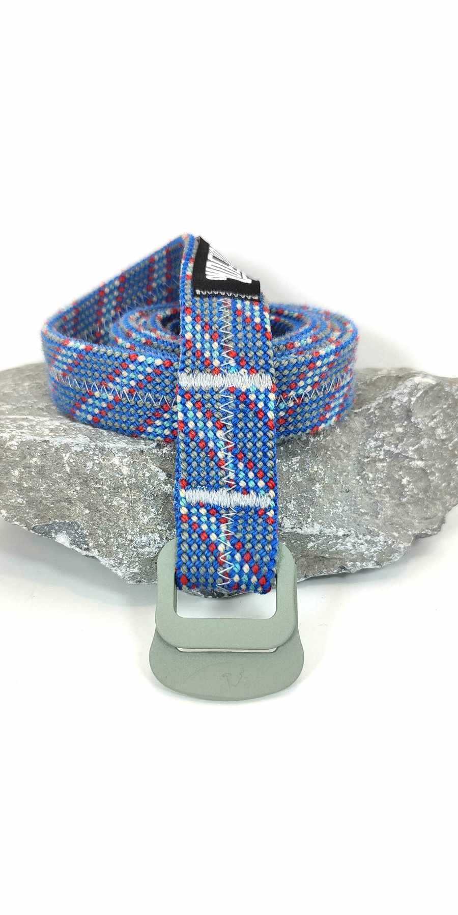 Réalisée à partir d'une corde d'escalade et d'anneaux de baudrier réformés, cette ceinture s'adapte à la plupart des pantalons et se porte en toute occasion.
