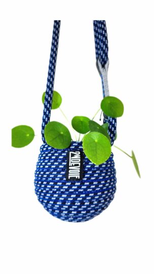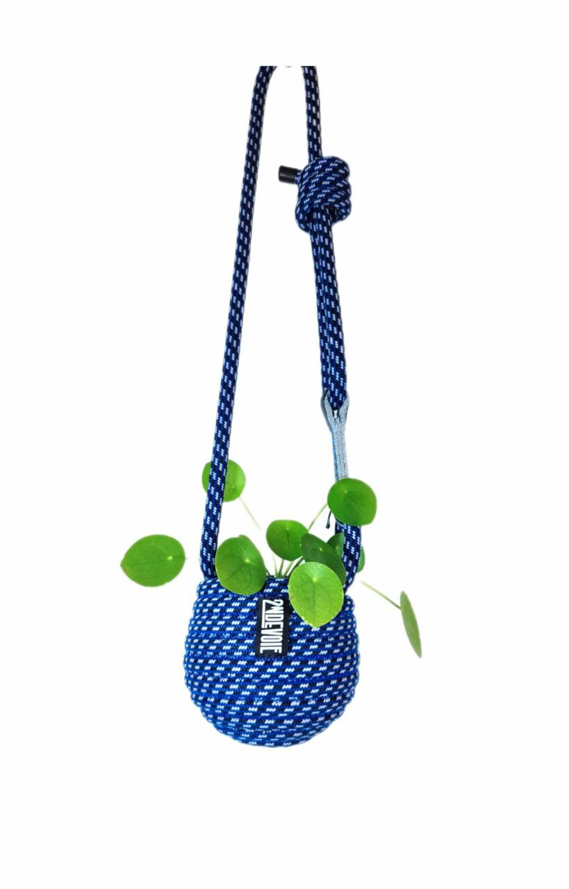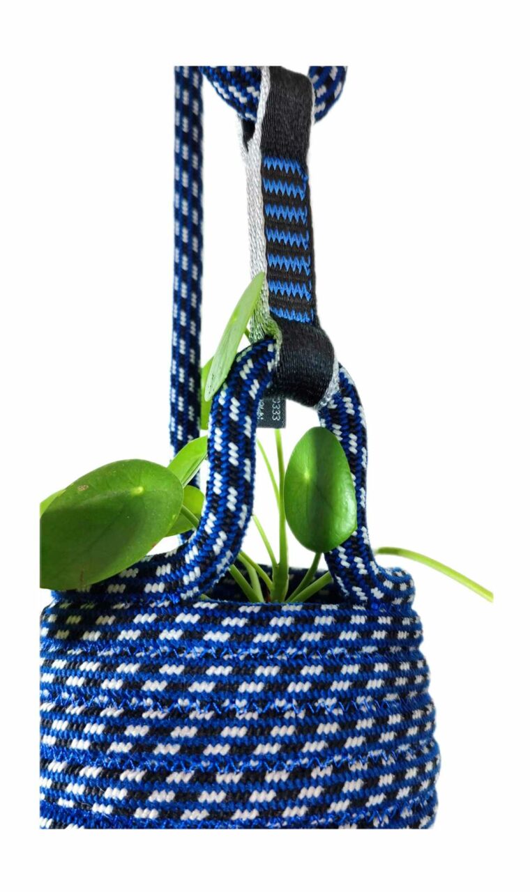 Petit pot en corde d'escalade upcyclée, cousue et sculptée au gré d'une intention. Objet décoratif à suspendre. Esthétique, durable et fabriqué avec une matière première robuste collectée localement.