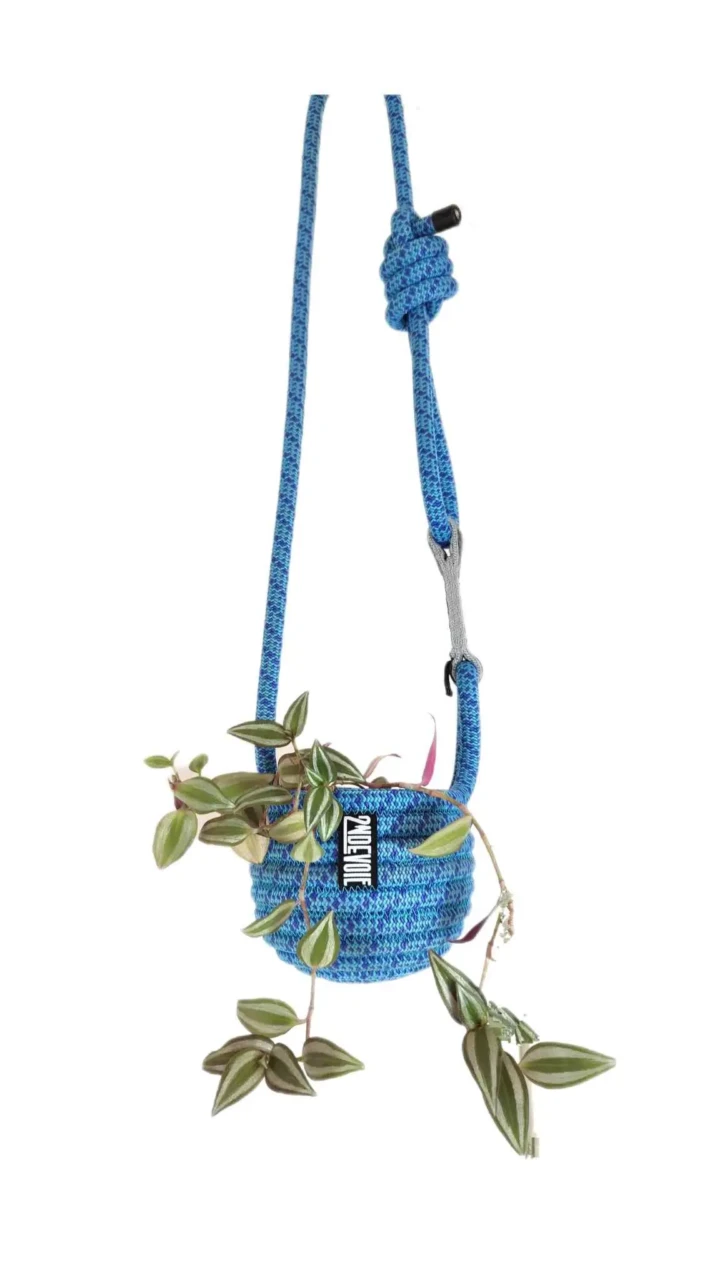 Pour la fabrication de ce pot 5m de corde sont revalorisés ♻️ ainsi qu'une sangle de dégaine. Le noeud coulisse et permet de régler la hauteur de suspension.