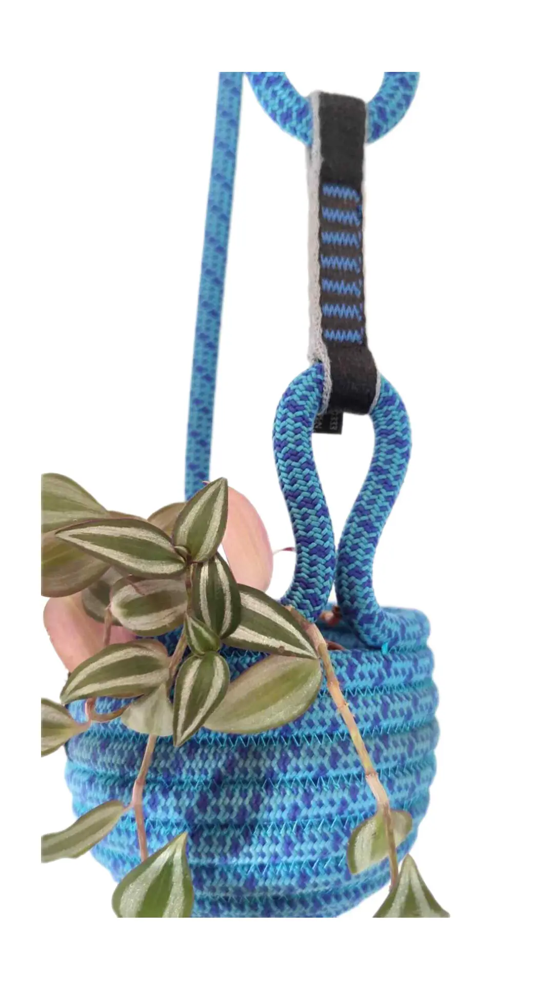 Petit pot en corde d'escalade upcyclée, cousue et sculptée au gré d'une intention. Objet décoratif à suspendre. Esthétique, durable et fabriqué avec une matière première robuste collectée auprès du Club Alpin Français du Comminges https://comminges.ffcam.fr/escalade.html