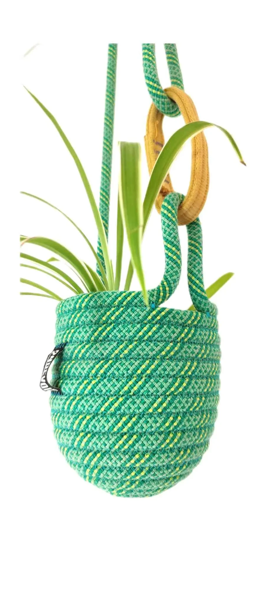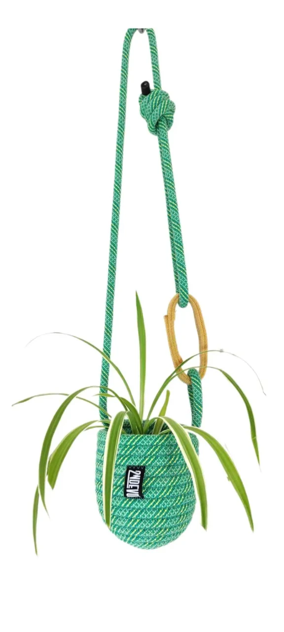 Petit pot en corde d'escalade upcyclée, cousue et sculptée au gré d'une intention. Objet décoratif à suspendre. Esthétique, durable et fabriqué avec une matière première robuste collectée localement.