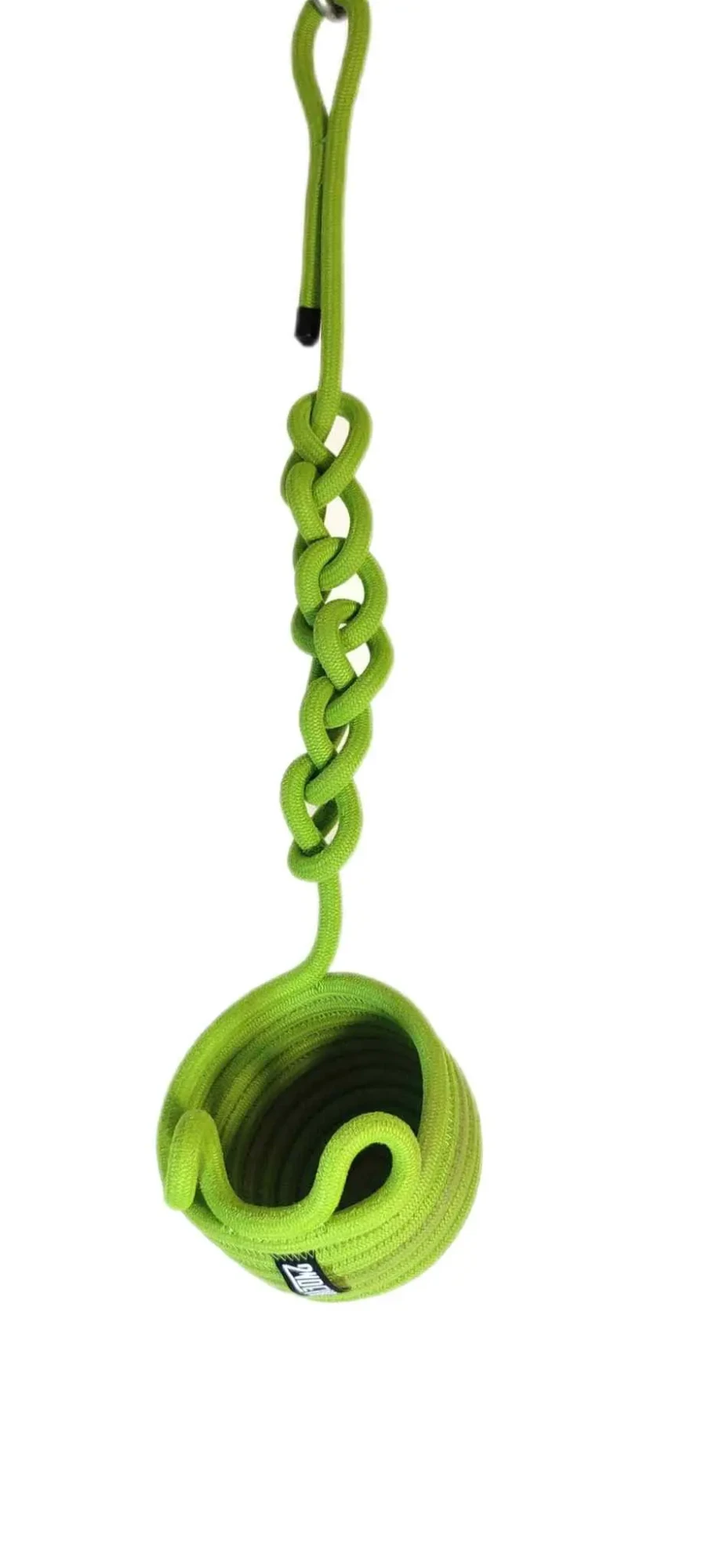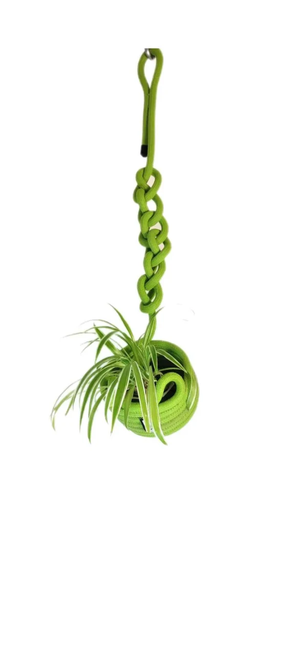Cette suspension est réalisée avec de la corde d'escalade upcyclée, elle est cousue et sculptée au gré d'une intention. Objet décoratif à suspendre, esthétique, durable et fabriqué avec une matière première colorée, robuste et collectée localement.