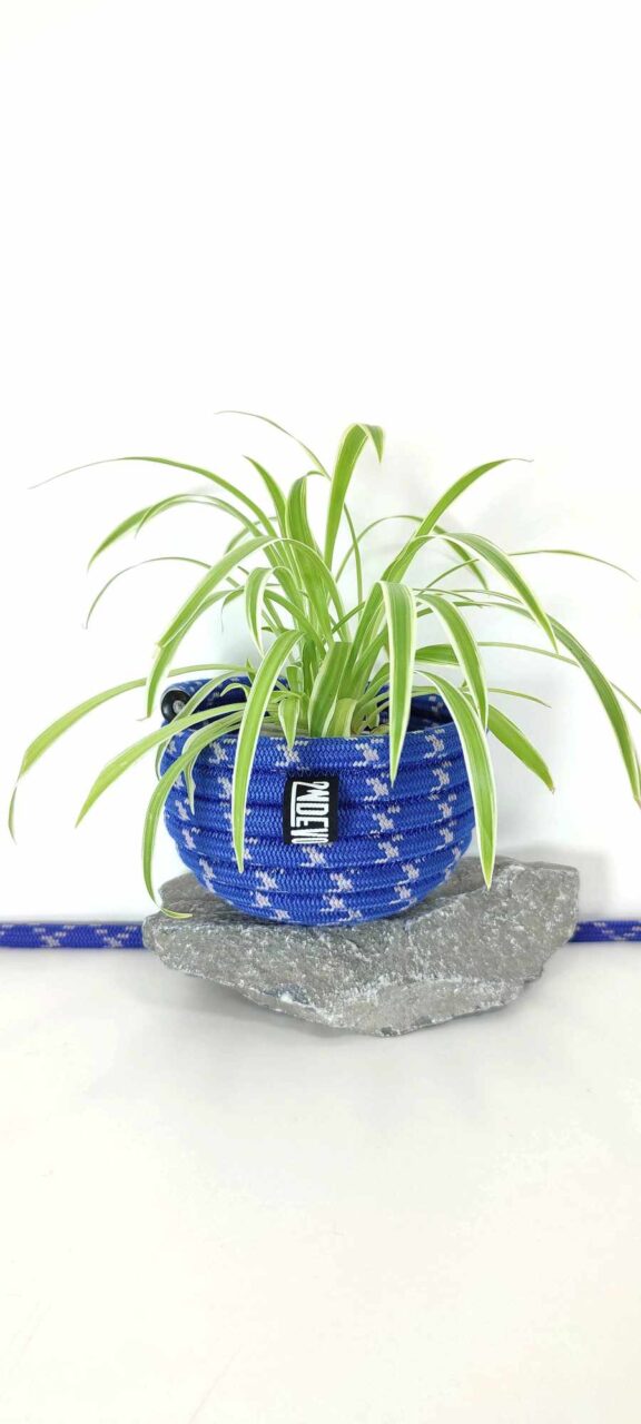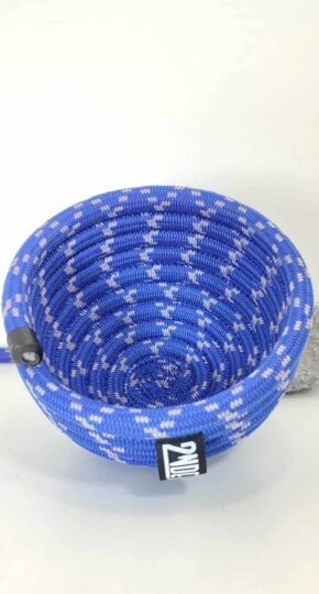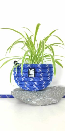 3m de corde sculptée. Petit pot en corde d'escalade upcyclée, cousue et sculptée au gré d'une intention. Objet décoratif, esthétique, durable et fabriqué avec une matière première robuste collectée localement.