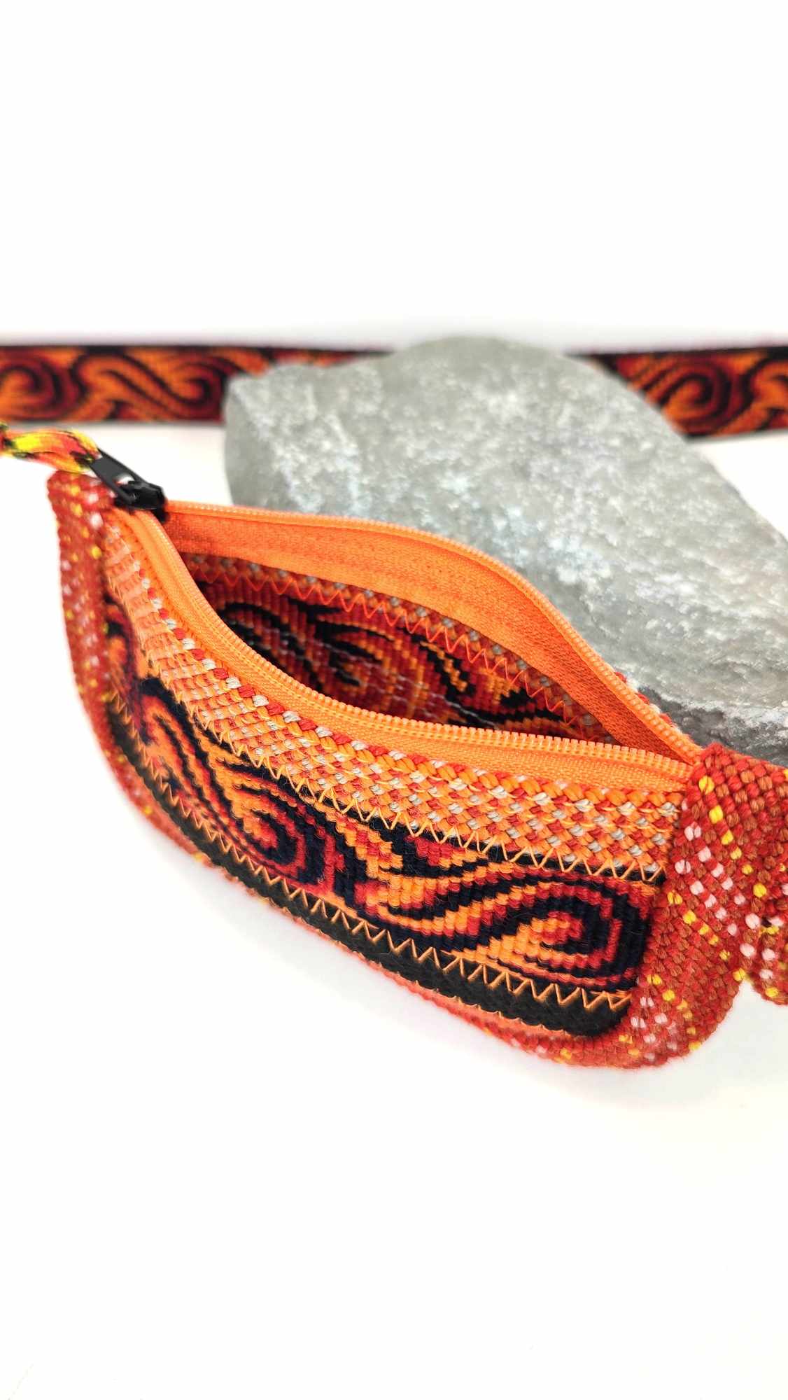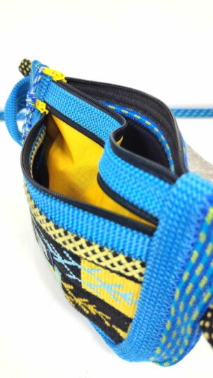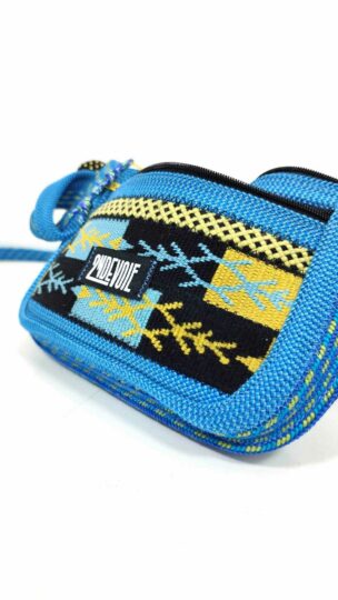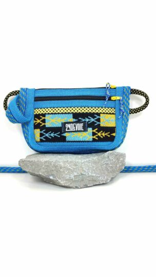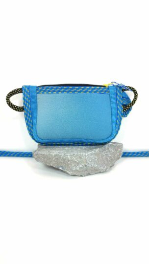 Pochette multifonction, un combo des sports de verticalité! La matière travaillée est issue de cordes et sangles de baudrier d'escalade, néoprène et voile de parapente recyclés.